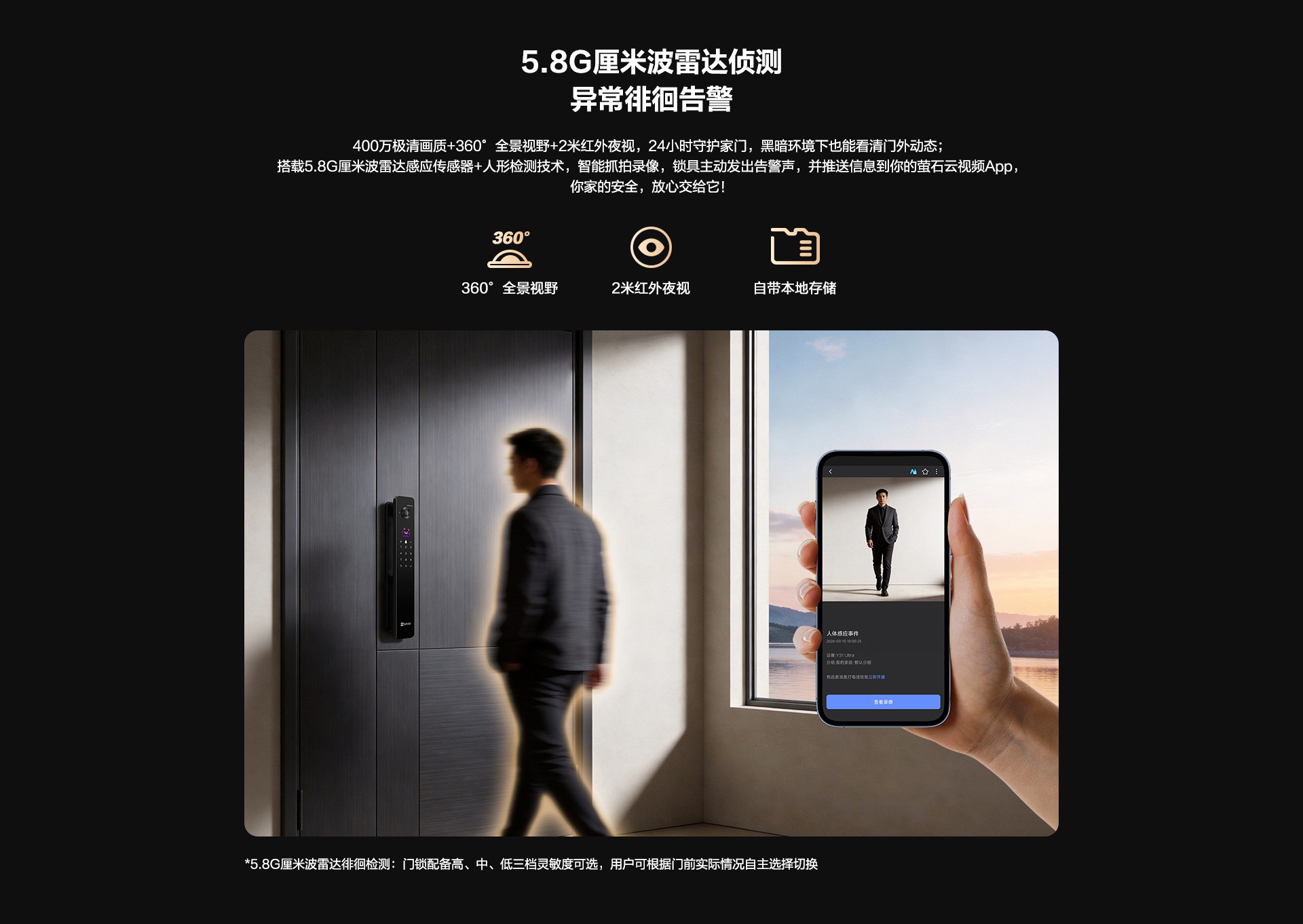 | 主动侦测 | 5.8G雷达感应触发后(可设置徘徊时间),采用人形检测进行智能过滤,推送更精确的人员告警信息 (人形检测默认开启,可选关闭,关闭后无人体感应告警信息) | |